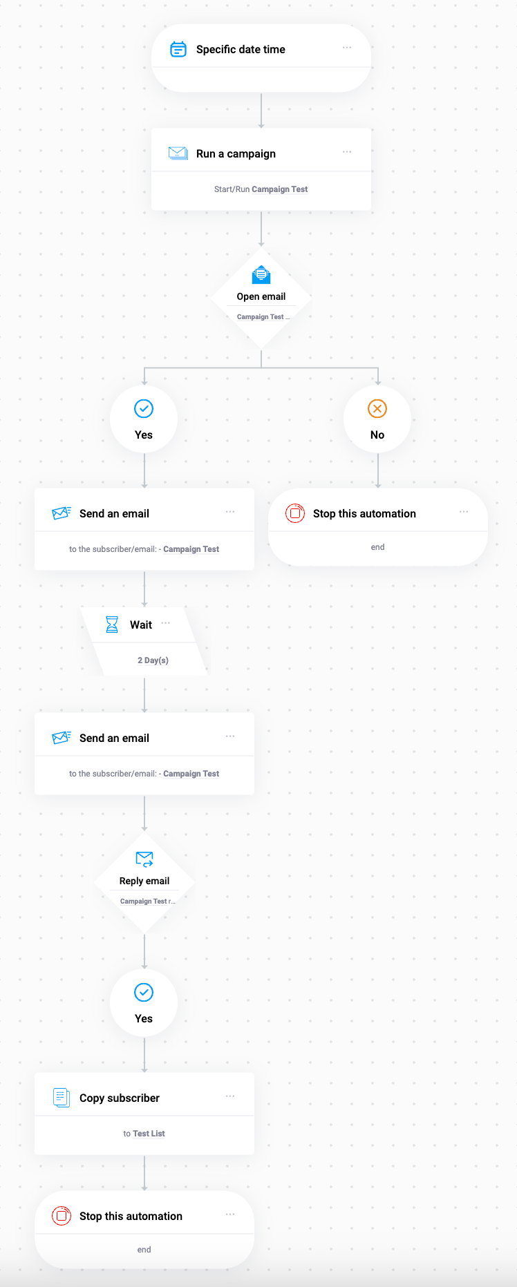 In this scenario, the automation starts by sending an email on a specific date and time. If the subscriber opens the email, they receive a series of follow-up emails spaced out by 2 days. The system also checks if the subscriber responds to any of these follow-up emails and may add them to a more engaged list. If the subscriber doesn’t open the initial email, no further emails are sent, and the automation stops.