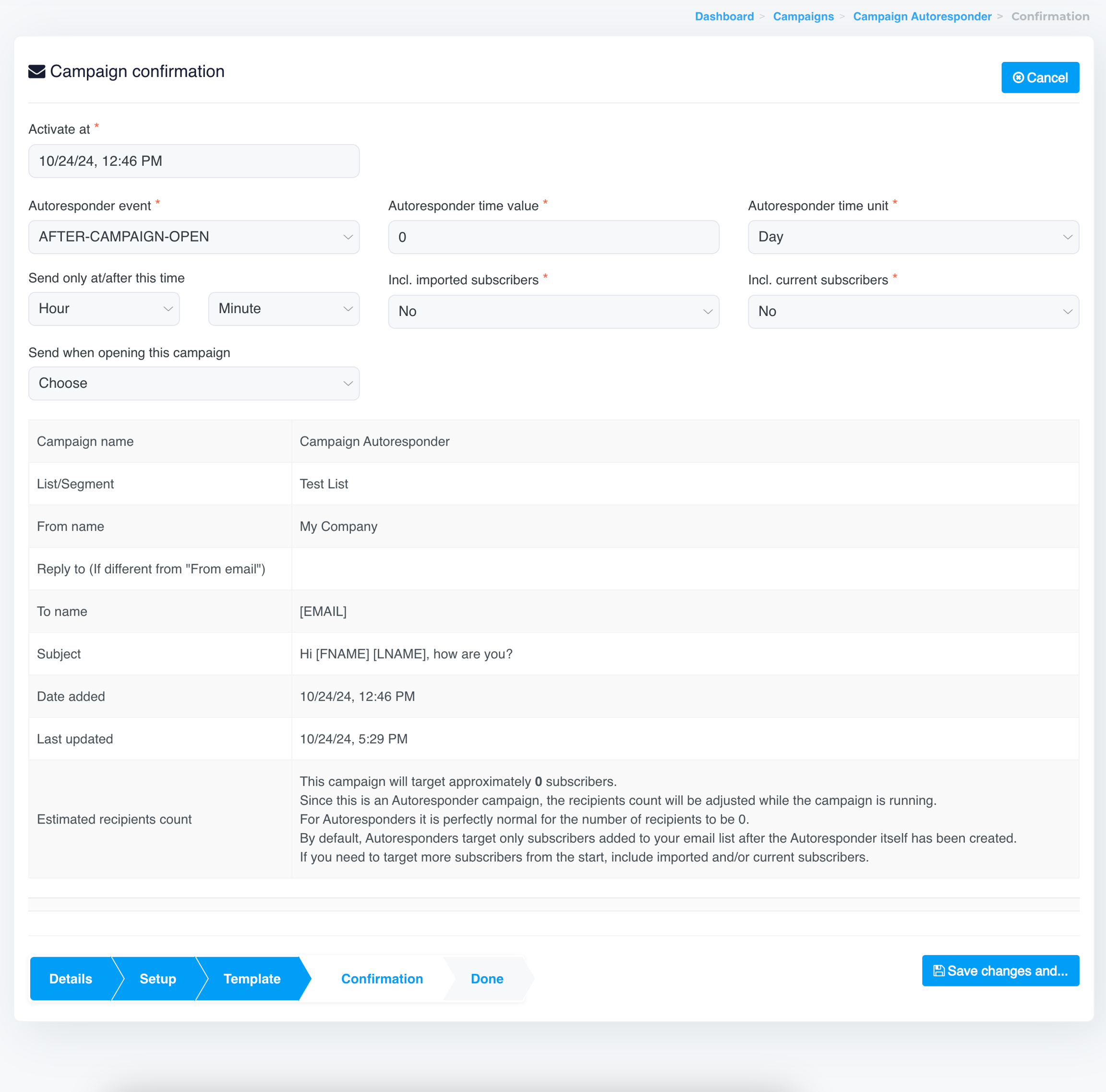 The Campaign Confirmation page for Autoresponders has some specific options that control how and when emails are sent: