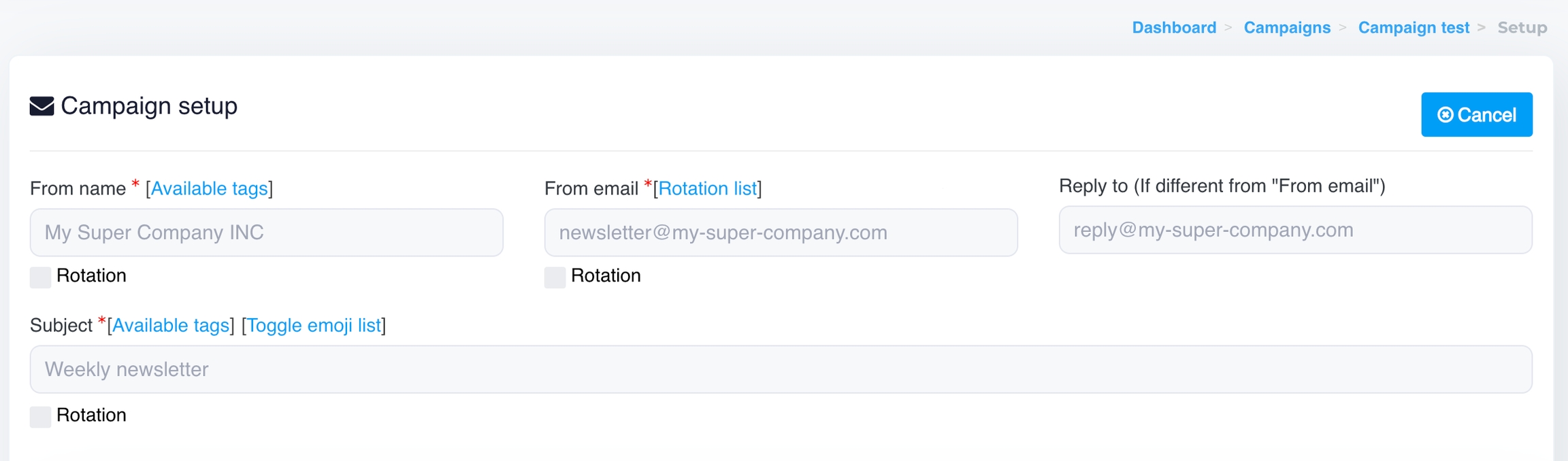 Rotation Options: (Optional) Enable rotation for From Name, From Email, and Subject to randomize these fields for each recipient, enhancing personalization.