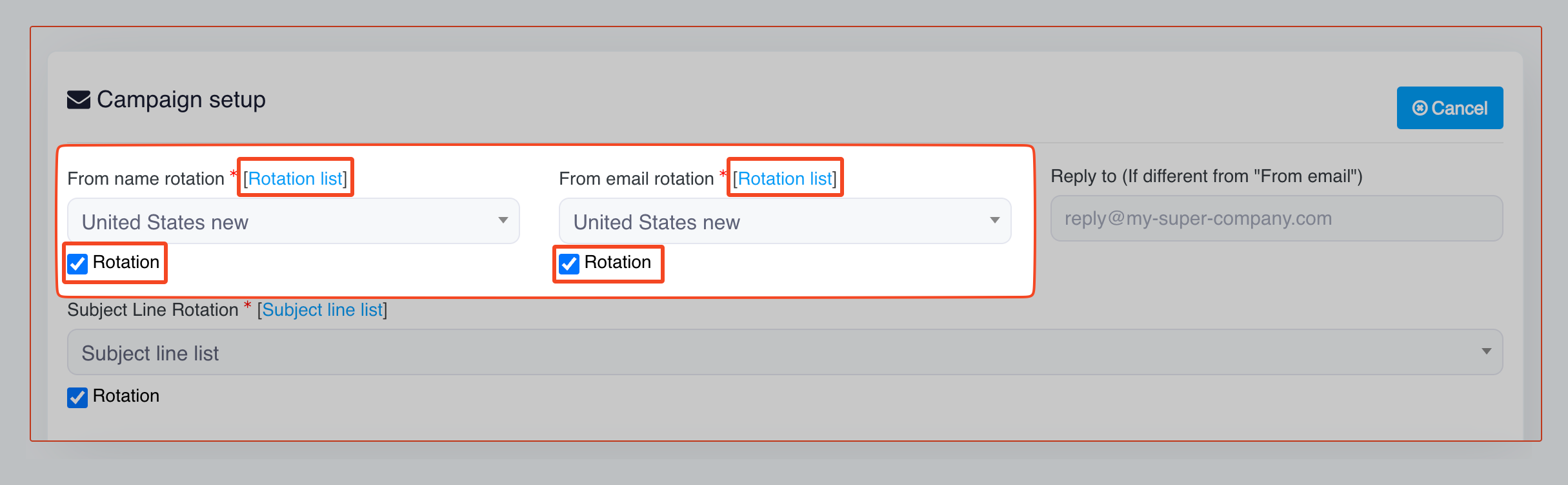 * In [**Campaign Setup**](https://docs.bulkemailsetup.com/cloudapp/popular-topics/email-campaign#step-2-campaign-setup), check the **Rotation** box next to each field.