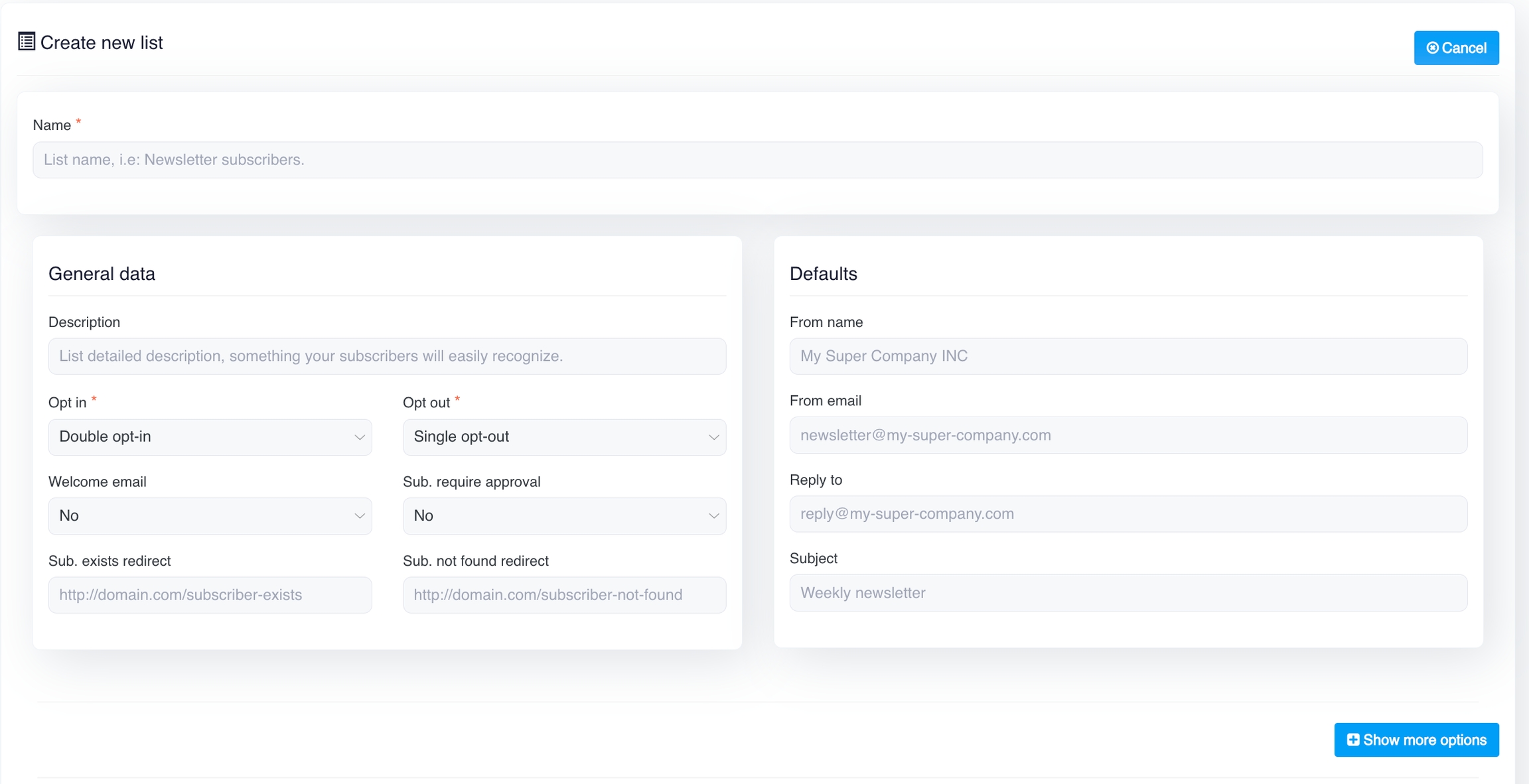 The Show More Options section provides advanced settings for additional customization when creating or managing a contact list. Here’s a summary of the available options: