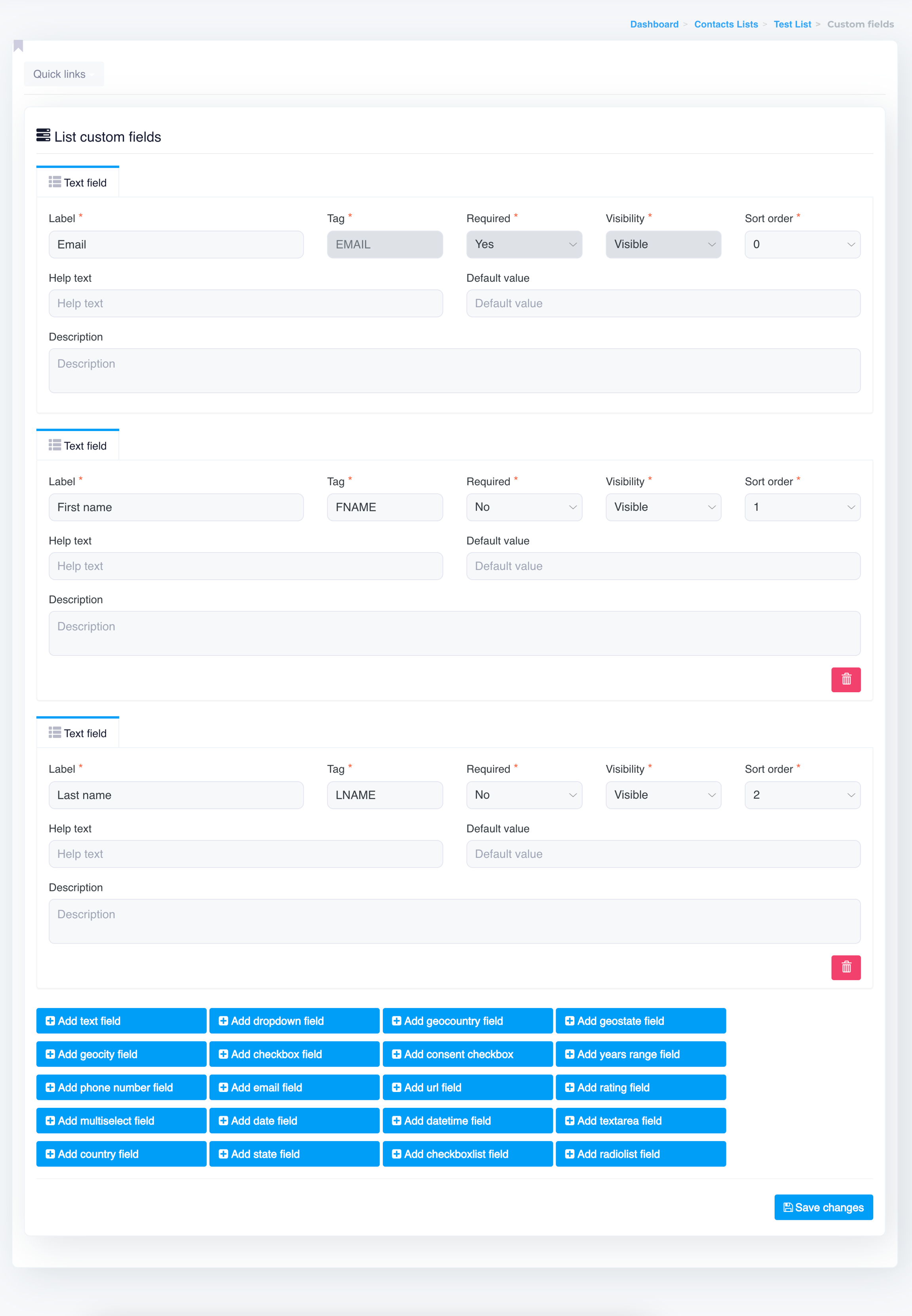 After you’ve added, updated, or removed fields, click on the Save changes button to apply the updates to your contact list.