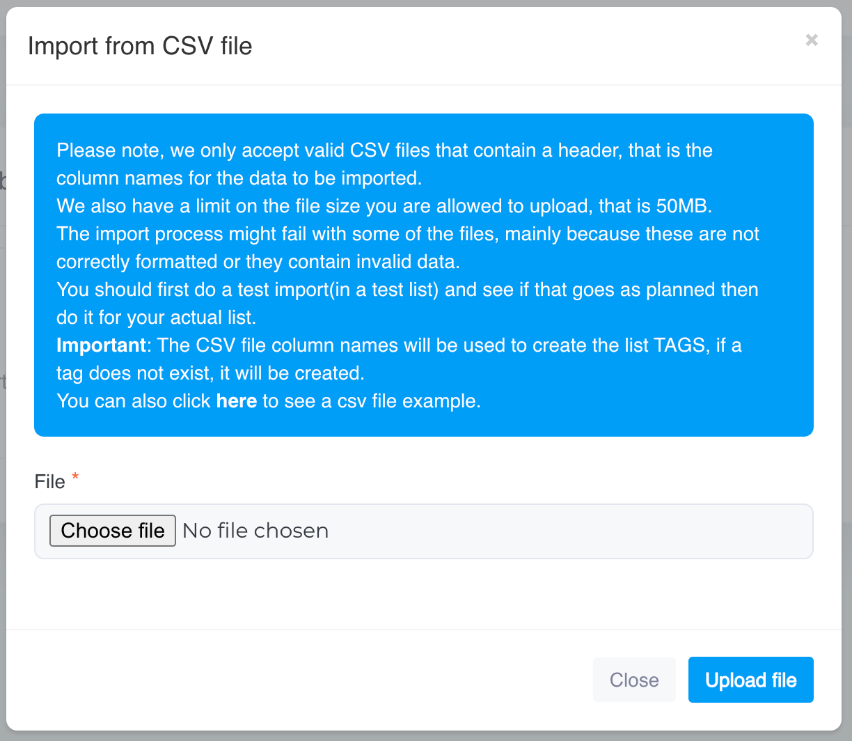 You can upload a file with a maximum size of 50 MB at once. If you have multiple lists to upload to the same contact list, you can do so in separate uploads, keeping each file size under the 50 MB limit. This allows you to import large amounts of data incrementally while staying within the upload size restriction.