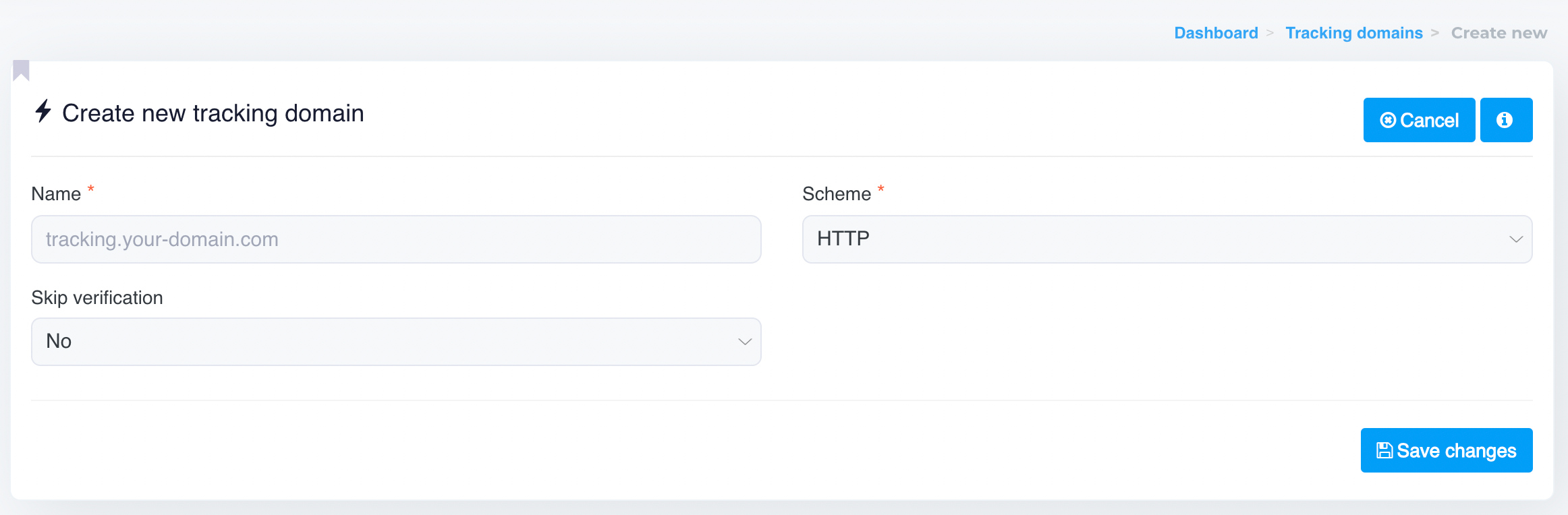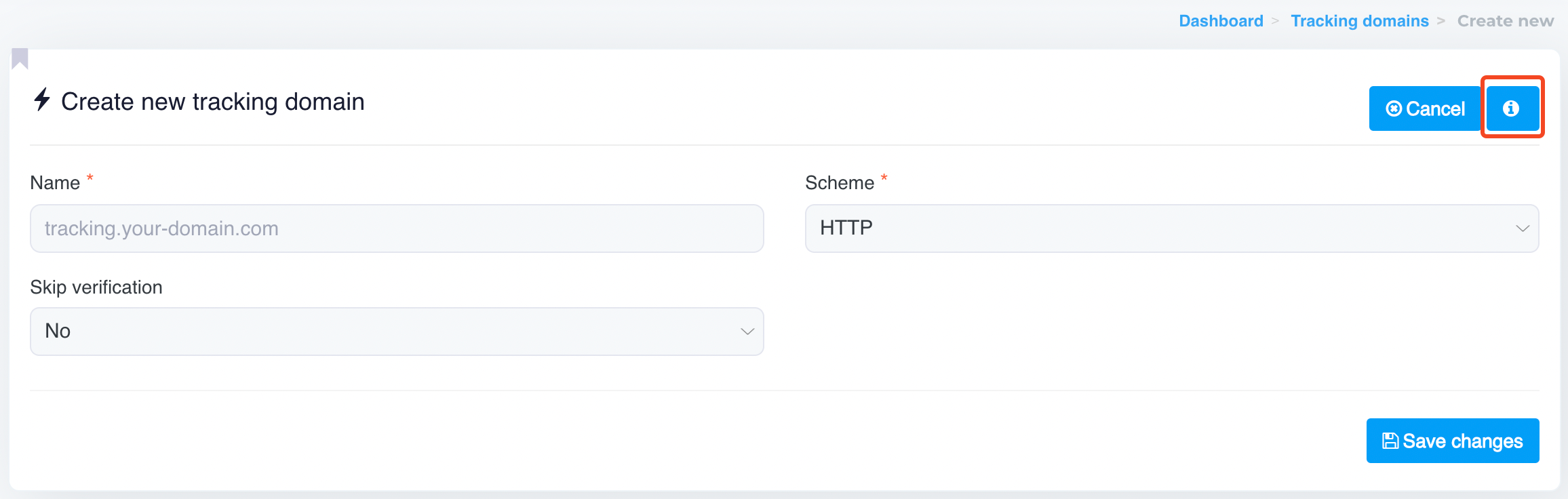 * **Name**: Enter your tracking domain (e.g., `tracking.your-domain.com`). Ensure this subdomain is configured in your DNS records before proceeding.