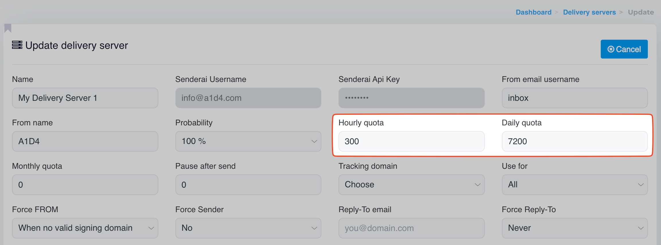 The configuration of your email delivery servers, including the hourly and daily quotas.