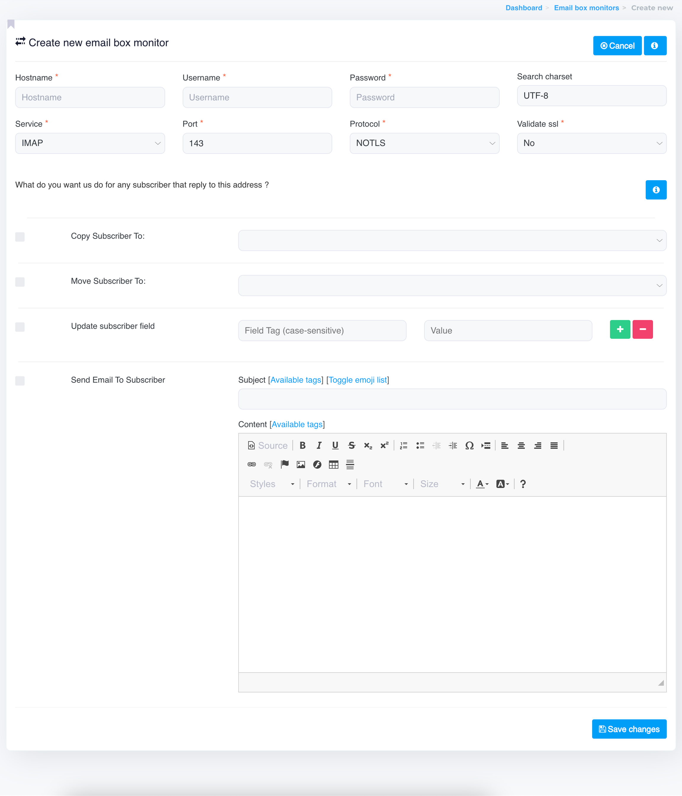 Configure any additional options, like charset and SSL validation, based on your inbox provider’s specifications.