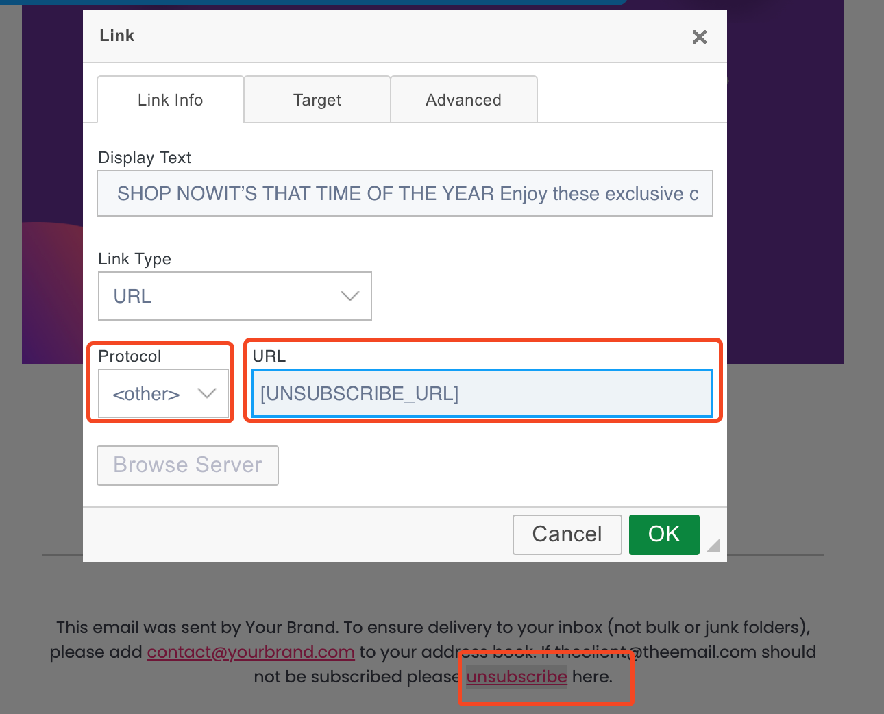 [UNSUBSCRIBE_URL]tag, follow these steps:Select the text you want to use as the hyperlink, such as “click here to unsubscribe” or similar.