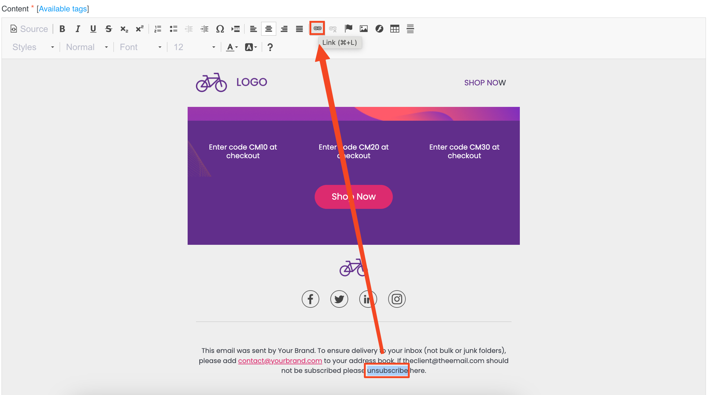 To comply with email marketing regulations and give recipients the option to opt out, it's essential to include an unsubscribe link. Here's how to add one in the editor:
