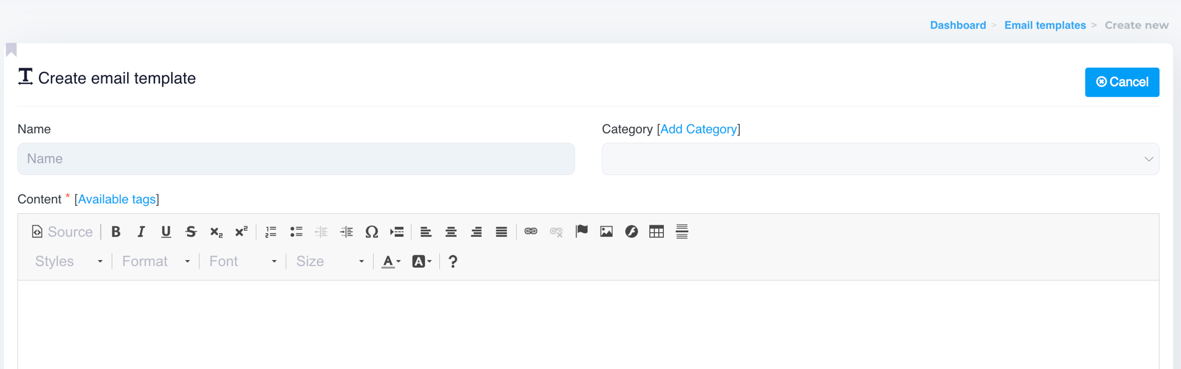 This page is designed for creating a new email template, which can be saved and reused for future campaigns or customer communications.
