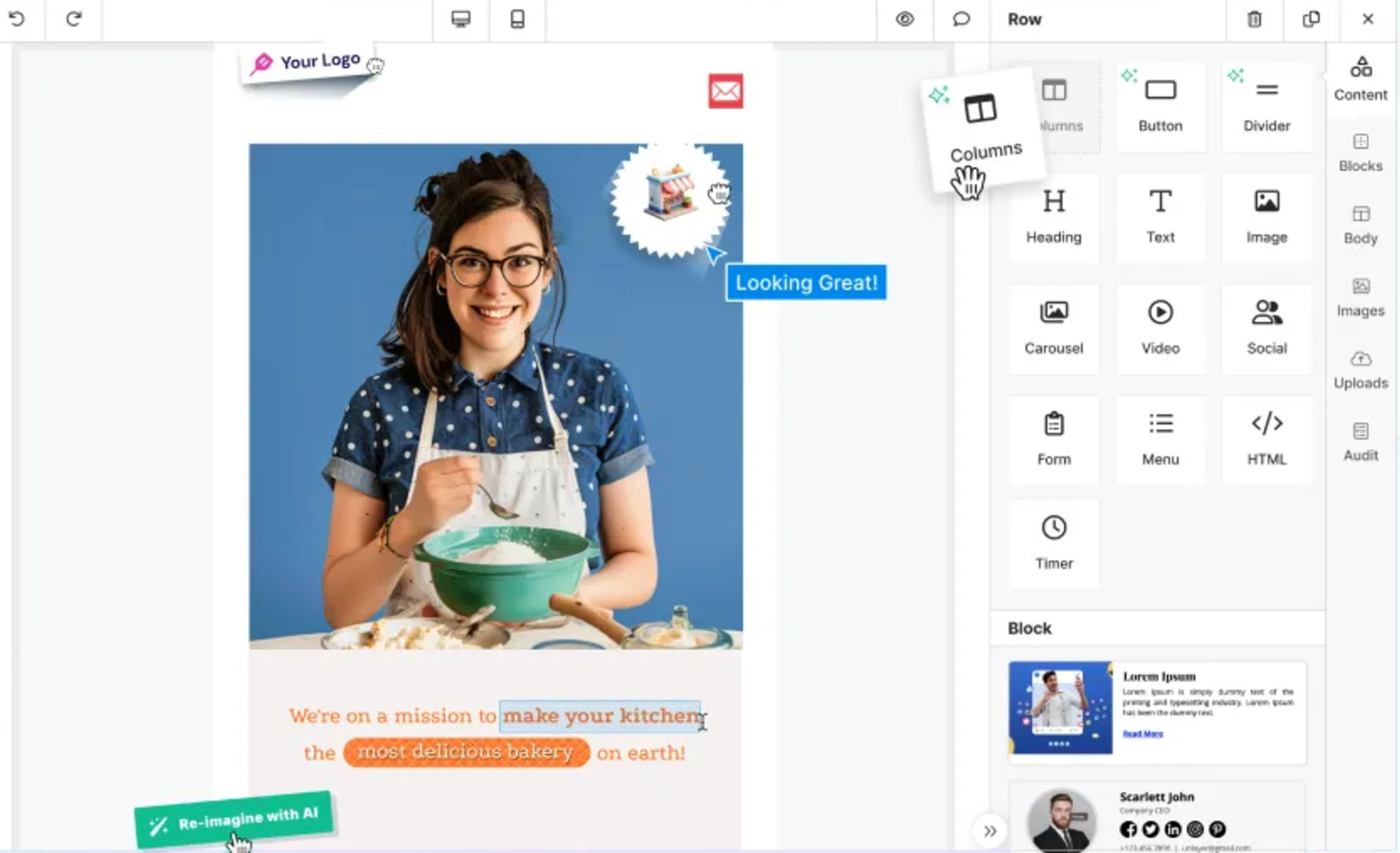 Image Blocks: Insert images to make your email visually appealing. Ensure that the images are optimized for quick loading.