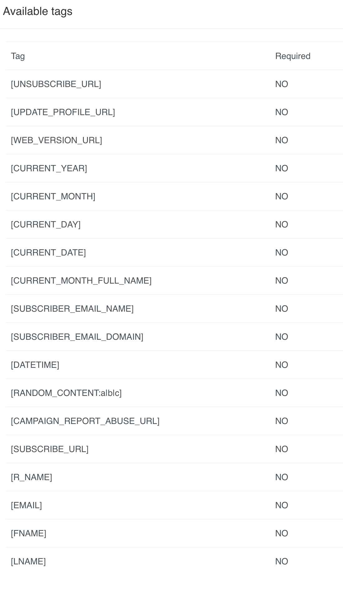 * **Link Tags**: Tags like `[UNSUBSCRIBE_URL]`, `[UPDATE_PROFILE_URL]`, `[WEB_VERSION_URL]`, and `[SUBSCRIBE_URL]` allow you to insert dynamic links for user actions. These links enhance user experience by making it easy to manage preferences or view the email online.