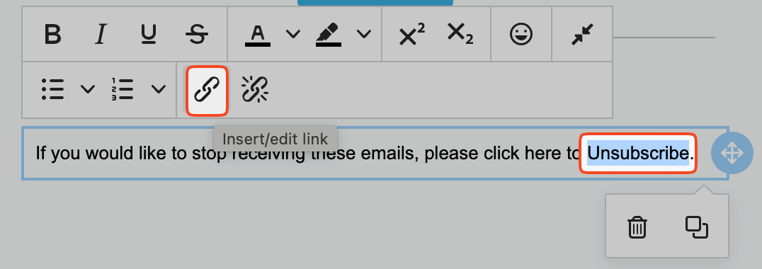 Select the text you want to use as the hyperlink, such as “click here to unsubscribe” or similar.