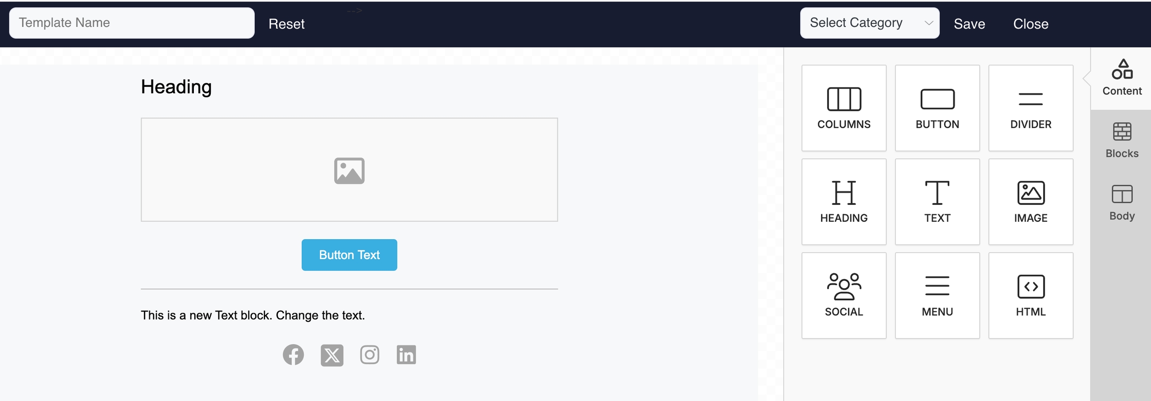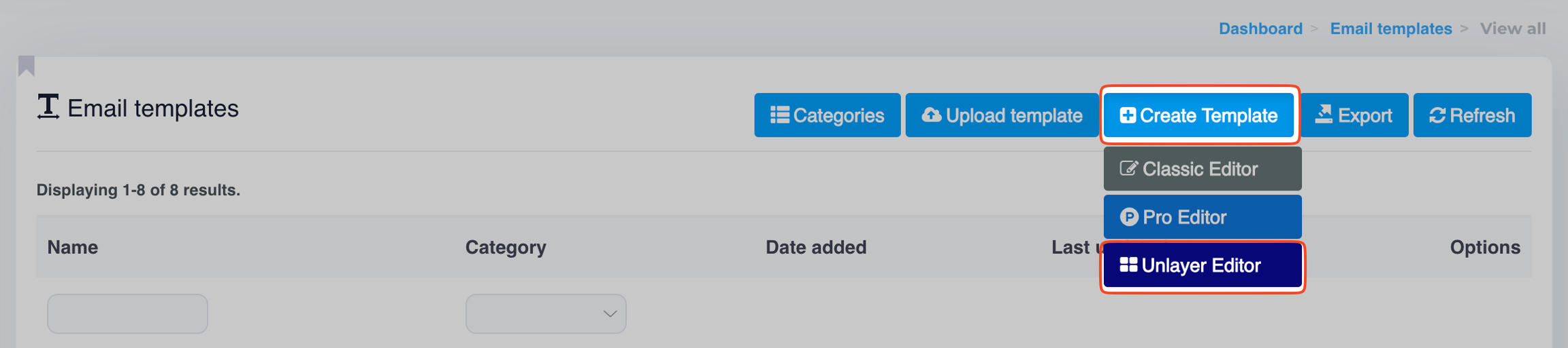 Create beautiful emails with Unlayer drag-and-drop editor. Add images, buttons, and text effortlessly. Organize templates by category for easy access. Ideal for all email campaigns.