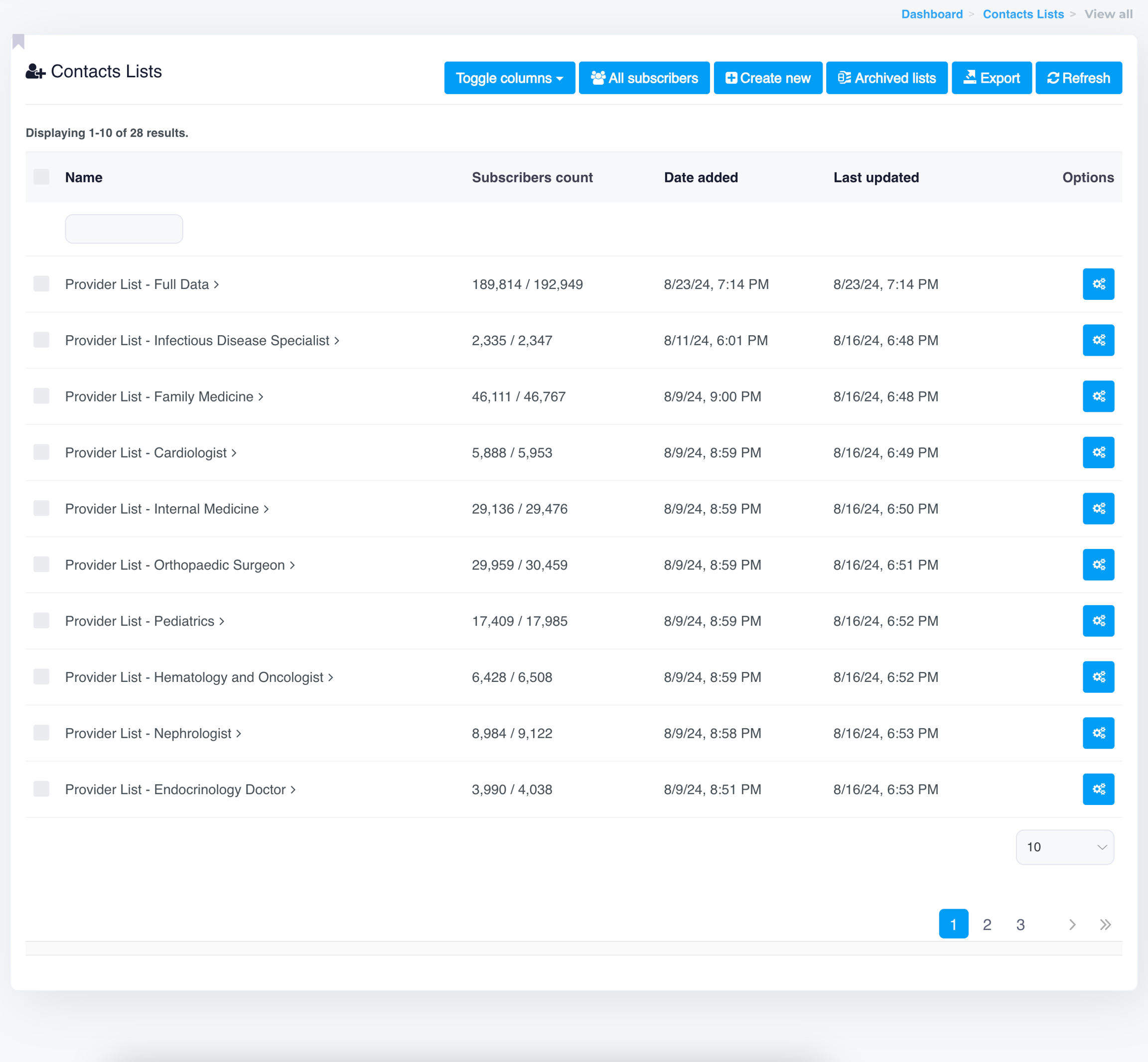 1 / 1,2 / 3). This count helps in keeping track of how many contacts are active and reachable.Date Added: The Date Added column shows when the contact list was created. This information is useful for understanding how long a list has been in use, which can help in evaluating its performance over time.