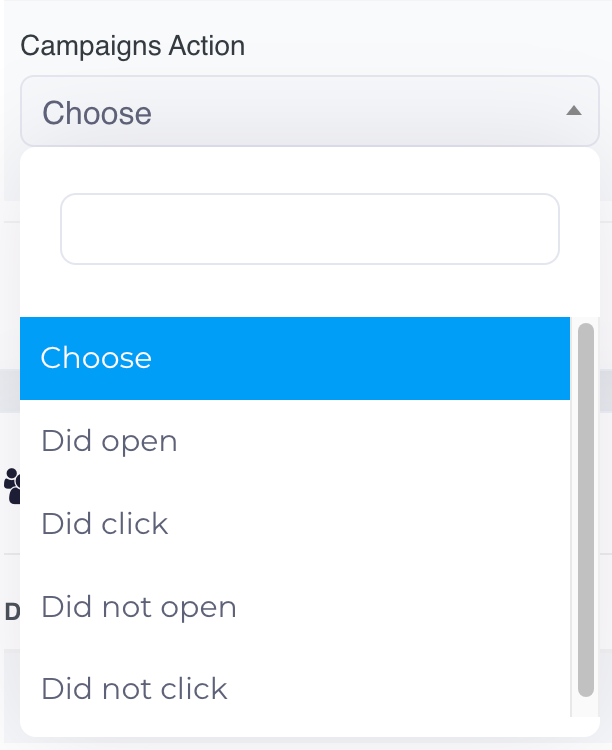 Campaigns Action: This allows you to filter contacts based on actions taken during a specific campaign, such as opened emails, clicked links, or other engagement metrics.