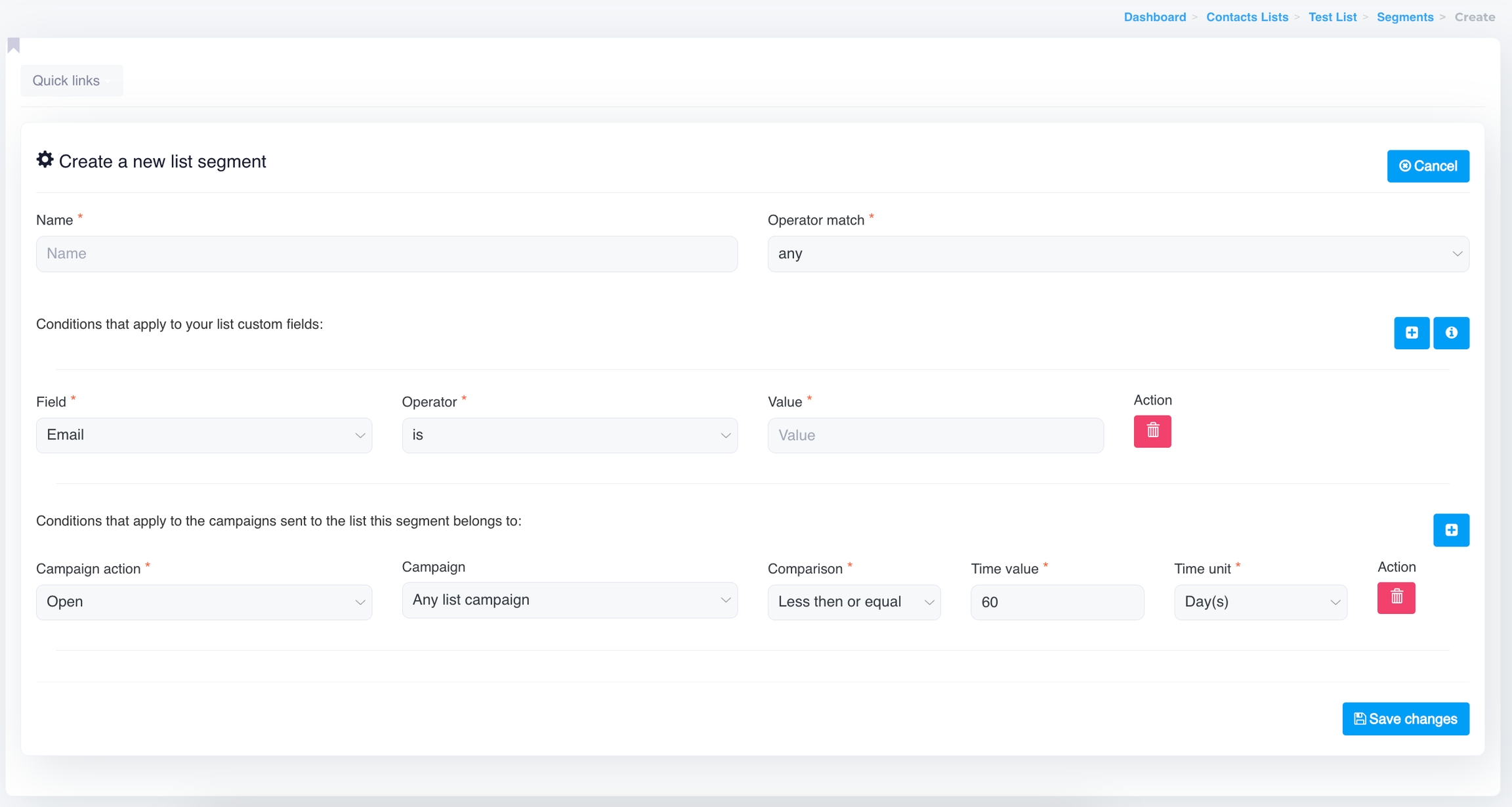 Once all conditions are set, click on Save changes to create and save the segment. The system will now segment your contact list based on the specified criteria.