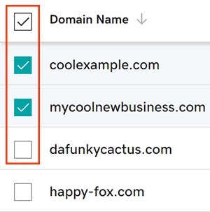 In your Domain Portfolio, check the boxes next to the domains you wish to modify. To select all domains, check the box next to "Domain Name" and choose "Select All."